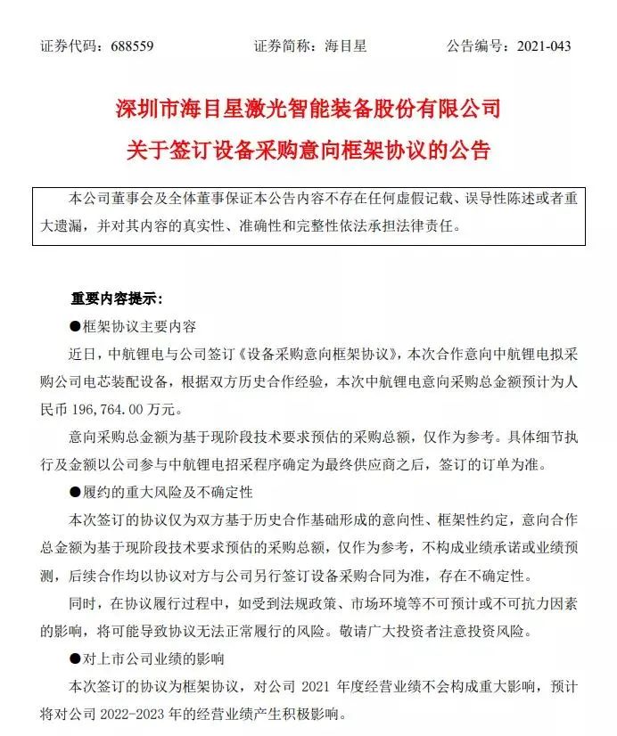 8月2日,海目星激光发布“关于签订设备采购意向框架协议的公告”。公告显示,公司与中航锂电签订《设备采购意向框架协议》,本次合作意向中航锂电拟采购公司电芯装配设备,根据双方历史合作经验,本次中航锂电意向采购总金额预计为19.68亿元。