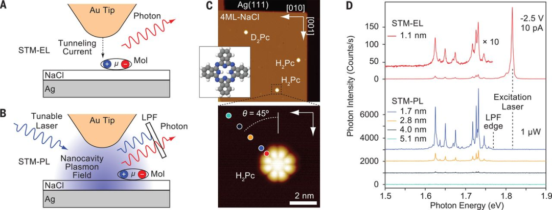 论文的作者之一Imada表示利用一个确定频率的外部激光源可以在STM尖端和金属基板之间的纳米级间隙中形成的局部等离子体的电磁场,该等离子体场的横向尺寸直径约为2 nm,比传统光学器件中的最小光斑还要小两个数量级,可用作纳米级单色、可调和移动的激发源。该研究的另一个关键点是等离子体场源的频率可以通过改变外部激光源的波长来进行调整,从而可以利用等离子体场完成单个分子的激发,以实现微电子伏特能量分辨率的光谱测量。