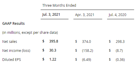 日前,美国Coherent公司公布了截至 2021年7月3日的第三财季财务业绩。2021财年第三季度,Coherent宣布净销售额为3.96亿美元,净收入为3030万美元。与去年同期相比,Coherent净销售额同比增长32.69%,与上一季度相比销售额增长5.83%。