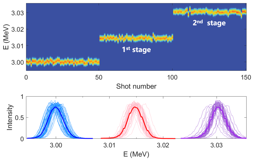 在通过精确控制太赫兹的频率分布以增加有效作用距离方面,实验中仅用100 nJ的太赫兹能量便实现了15 keV的净能量增益,太赫兹能量转化为电子束能量增益的效率达到了1.5 keV/nJ1/2,是目前实验报道的最高效率,预示着利用mJ级别的太赫兹脉冲可实现MeV的能量增益。此外,超快电子衍射装置提供的超短电子束,也为验证太赫兹加速器的稳定级联加速提供了可能。实验中进一步利用两个独立的太赫兹源分别驱动电子束在两段长度为3 cm的介质波导中实现了电子束的稳定级联加速。得益于电子束较短的脉宽和较小的时间抖动,级联加速实验中维持了电子束的能散和能量稳定性(图3),获得接近100%的级联耦合效率,实现了从“太赫兹加速”向“太赫兹加速器”的飞跃,为将来更多级的级联提供了实验依据。