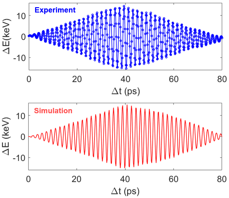 张杰院士与向导教授课题组近年对强场太赫兹脉冲与相对论电子束的相互作用进行了系统研究,突破了太赫兹源、太赫兹结构精密制备(图1)、太赫兹场与电子束精密同步匹配等多项技术挑战,取得了利用太赫兹波长作为基准精确测量电子束时间信息【Phys. Rev. X 8, 021061 (2018)】,太赫兹示波器【Phys. Rev. Lett. 122, 144801 (2019)】,太赫兹驱动电子束脉宽压缩【Phys. Rev. Lett. 124, 054802 (2020)】等系列成果。近期,课题组利用尺寸比传统射频加速结构小100倍的直径仅0.86 mm的介质波导,结合窄带宽太赫兹源,实现了相对论电子束在介质波导中持续3 cm的稳定加速。通过改变电子束与太赫兹脉冲的延时,可精确观察到作用距离和作用相位的改变所引起的电子束能量增益的变化,实验结果与理论模拟具有很高的符合度(图2)。