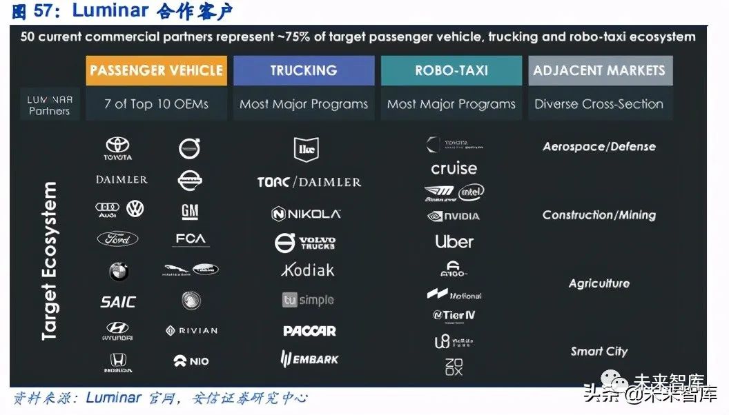 2012 年 Luminar 由 Russel 在硅谷创立,并在之后专注于车载雷达技术的突破性研究,旗下 的 Iris 激光雷达拥有着行业内较为领先的性能,在小于 10%的反射率下可以实现 250m 的探测距离,并且在雨雪天气下也可以达到 200 以上的探测距离。Luminar 的激光雷达的性能优势为其带来大量的合作客户,合作伙伴数量从 2017 年的 4 个增长到了 2020 年的 50 个,先后与丰田、沃尔沃等车企建立了研发合作关系,并于 2020 年 11 月达成了与 Intel 旗下自驾视觉处理系统商 Mobileye 的合作订单。除此之外,Luminar 还进一步与戴姆勒卡车公司 (Daimler Truck AG)建立合作伙伴关系,开拓自动驾驶卡车市场。
