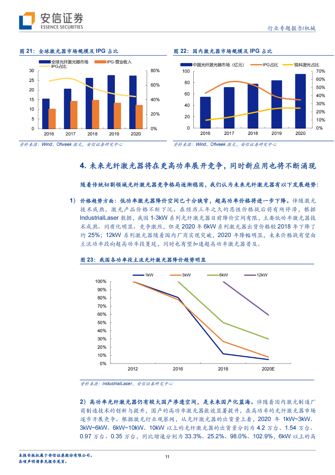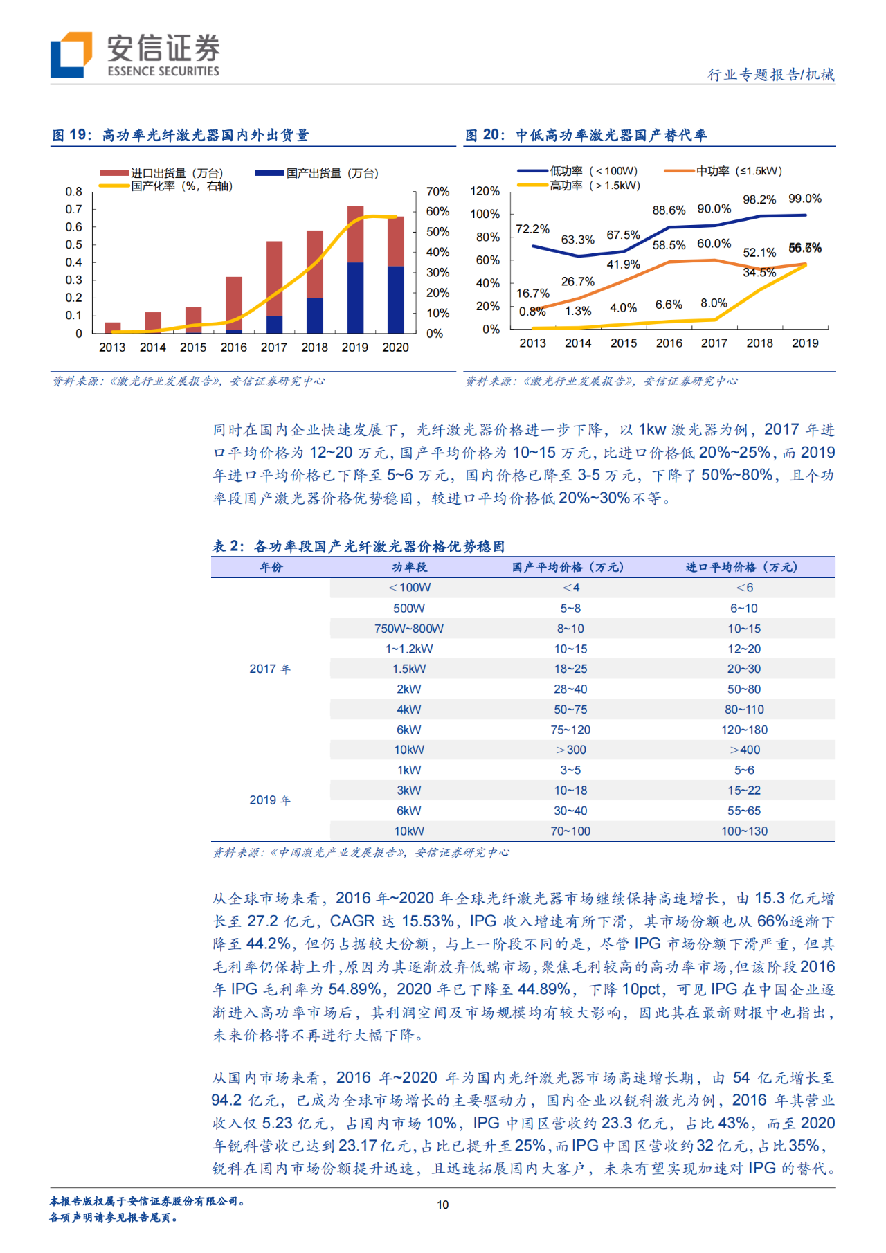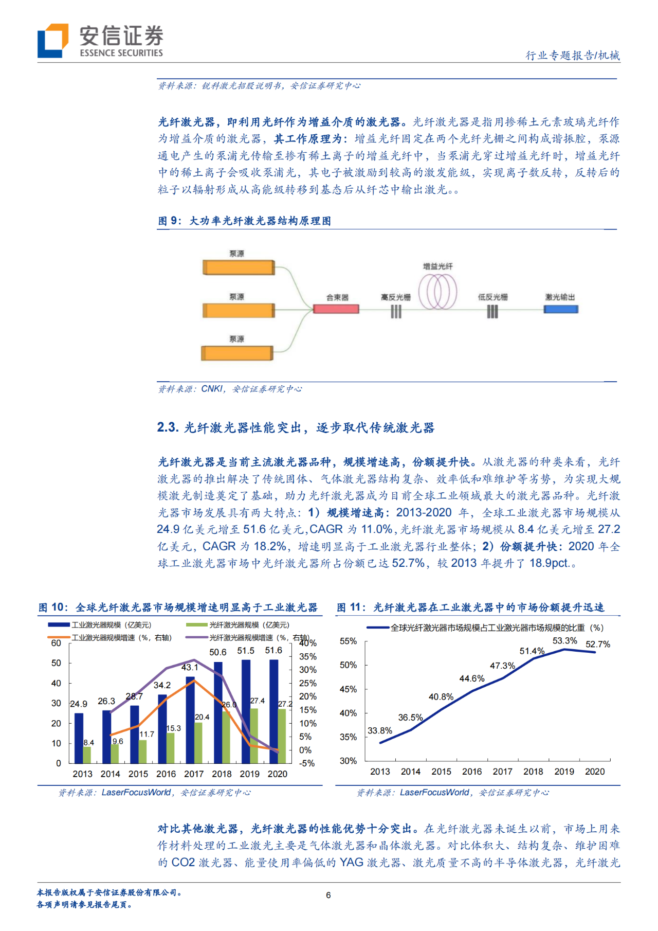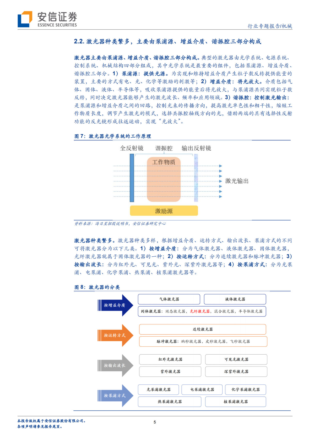 激光器是激光的发生装置,中国市场规模增速远高于全球。全球激光器市场规模由 2013 年的 93.6 亿美元增至 2020 年的 166.3 亿美元,CAGR 为8.6%;中国激光器与激光设备市场规模由 2013 年的 194.33 亿元增至 2019 年的 658 亿元, CAGR 为 22.5%,行业发展速度远高于全球。