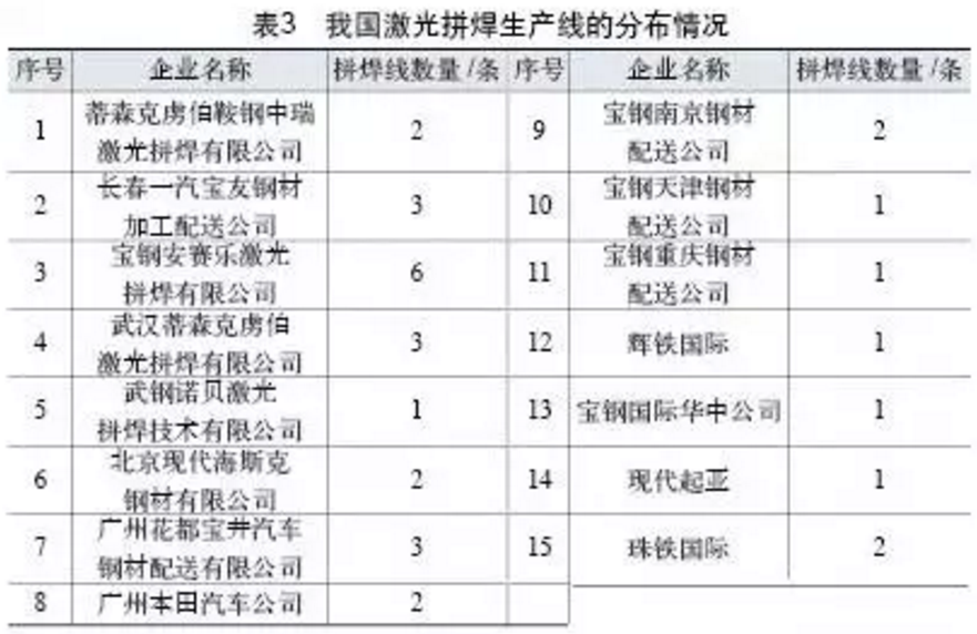 国内汽车厂也已开始在车身应用激光拼焊件,并已形成成熟便捷的激光拼焊板供应网络,如宝钢集团已分别于北方、中东部及南方建立了三家激光拼焊板加工配送中心,并且其进一步计划在重庆与武汉再建立两家激光拼焊板加工配送中心。当然还有其他厂商也有在国内生产和配送,如蒂森克虏伯的武汉生产基地等。