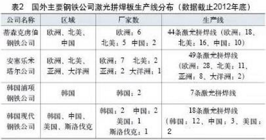 (4) 随着新兴汽车市场,尤其是中国汽车工业的发展,国外钢铁公司与国内大型钢企合资建设激光拼焊板生产线。此外,汽车板生产企业也采取与汽车厂、拥有激光拼焊技术的钢铁企业合资兴建的方式,逐步开拓市场稳定用户、提高工艺技术水平。