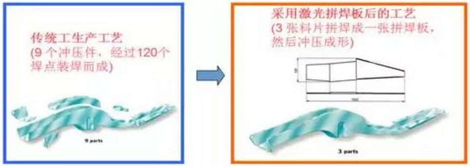 相比而言,激光拼焊板优势众多:降低工件重量,从而降低整车重量;减少累计公差,利用拼焊板冲压,可以使零件一次冲压成型,不需要将几个零件焊成一个零件,大大提高了零件尺寸精度;激光焊接代替传统电焊,时间可以得到大量节省,焊接质量得到质的提高;提高车身碰撞安全性能等等。