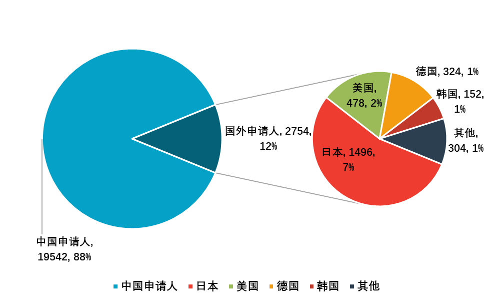国外申请人仍保持在国内专利布局,日本、美国、德国积极在华布局,其中,日本申请人在中国申请量最多,占比7%。国内创新主体在国内申请专利整体风险较小。