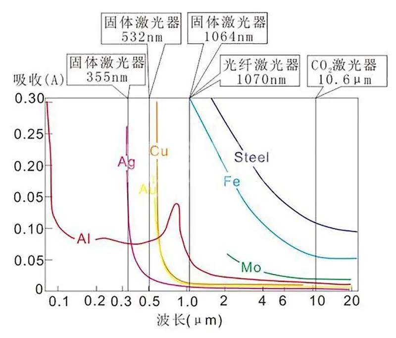 一般来讲,高反指的是由于加工材料电阻率较小,表面较为光滑,对近红外激光的吸收率较低,如图所示,为常见金属元素的吸收系数,这导致大量的激光发生发射,又因为大多数激光器的使用场景均为垂直于材料或者少量倾角。从而导致回返激光重新进入输出头,甚至部分回返光耦合进入传能光纤,沿光纤反向传输至激光器内部,使得激光器内部核心部件持续高温。