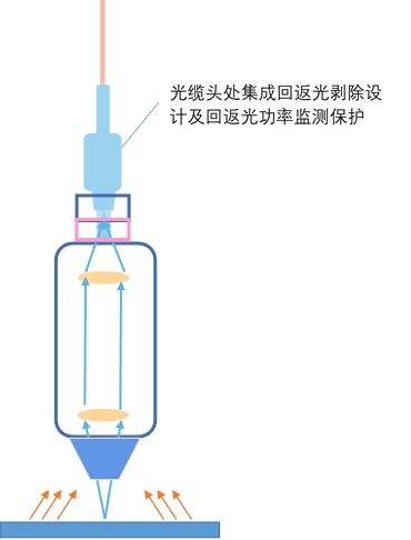 锐科激光设计的QBH、QD以及QP光纤输出头,能够高效的将不可控回返光转换为可以吸收的光和热,同时提升输出头的吸热和散热能力,从而能够最大程度的避免回返光对内部元器件的影响。对于激光加工系统来说,回返激光首先会对输出光缆头产生影响,使输出光缆出现发热甚至损坏的风险,为了保证输出光缆的安全,在原有设计的基础上,我们在输出光缆内部集成了一级回返光剥除装置,如图。光缆输出端加入抗高反光设计能够第一时间剥除大部分回返激光,降低对激光器内部光学结构的损伤,同时结合水冷散热设计,有效的将剥除的回返激光吸收,避免其对光缆输出头产生热影响。