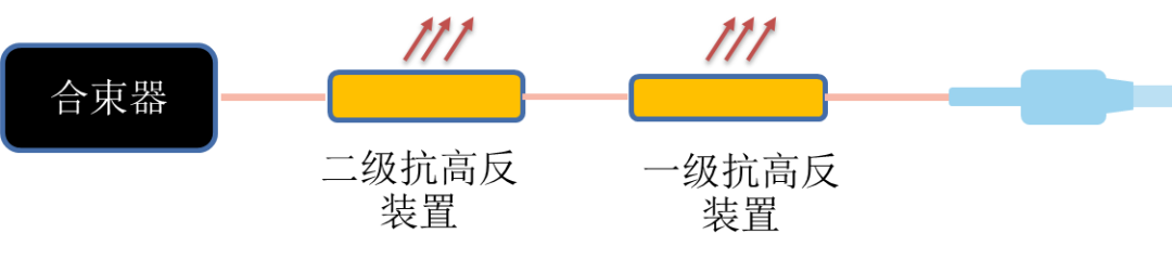 多模块高功率激光器产品主要基于多单元模块合束而成,切割高反材料时,回返光经过光缆处的一级抗高反设计后,仍可能有部分光经过输出光缆反向传输至合束内部。因此,考虑合束内的光学器件及光路设计的安全可靠性,合束内部增加了两级抗高反保护设计,如图,采用分步式逐级剥除回返激光,保证抗高反保护光学器件安全的同时,降低回返激光对激光器光路结构的影响。