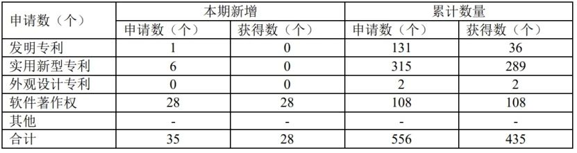 2021年上半年,公司多项研发工作达到预期目标,公司申请知识产权35项,其中发明专利1项、实用新型专利6项、软件著作权28项;获得授权软件著作权28项。截至2021年6月30日,公司累计获得授权知识产权435项,其中授权发明专利36项,授权实用新型专利289项,授权软件著作权108项。