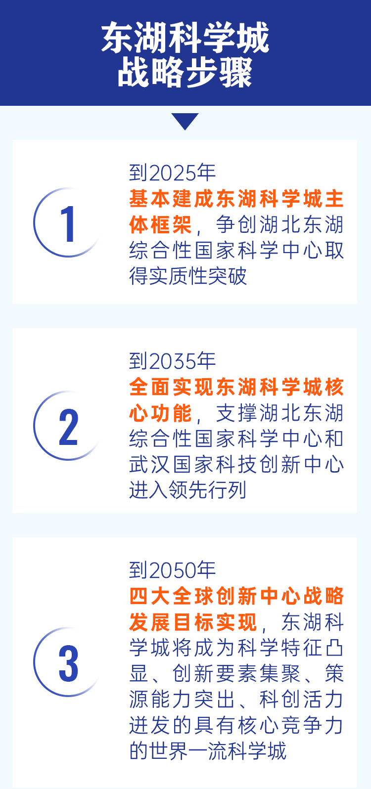 东湖科学城战略发展目标是:瞄准打造全球光电信息科技创新中心、全球生命健康科技创新中心、全球碳中和工程科技创新中心和全球智能制造产业创新中心,建成科学特征凸显、创新要素集聚、策源能力突出、科创活力迸发的具有核心竞争力的世界一流科学城。