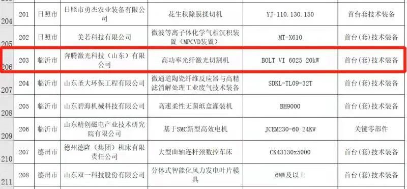 近日,根据《2021年度山东省首台(套)技术装备及关键核心零部件生产企业及产品公示名单》,奔腾激光科技(山东)有限公司“BOLT VI 20kW高功率光纤激光切割机”成功入先选。