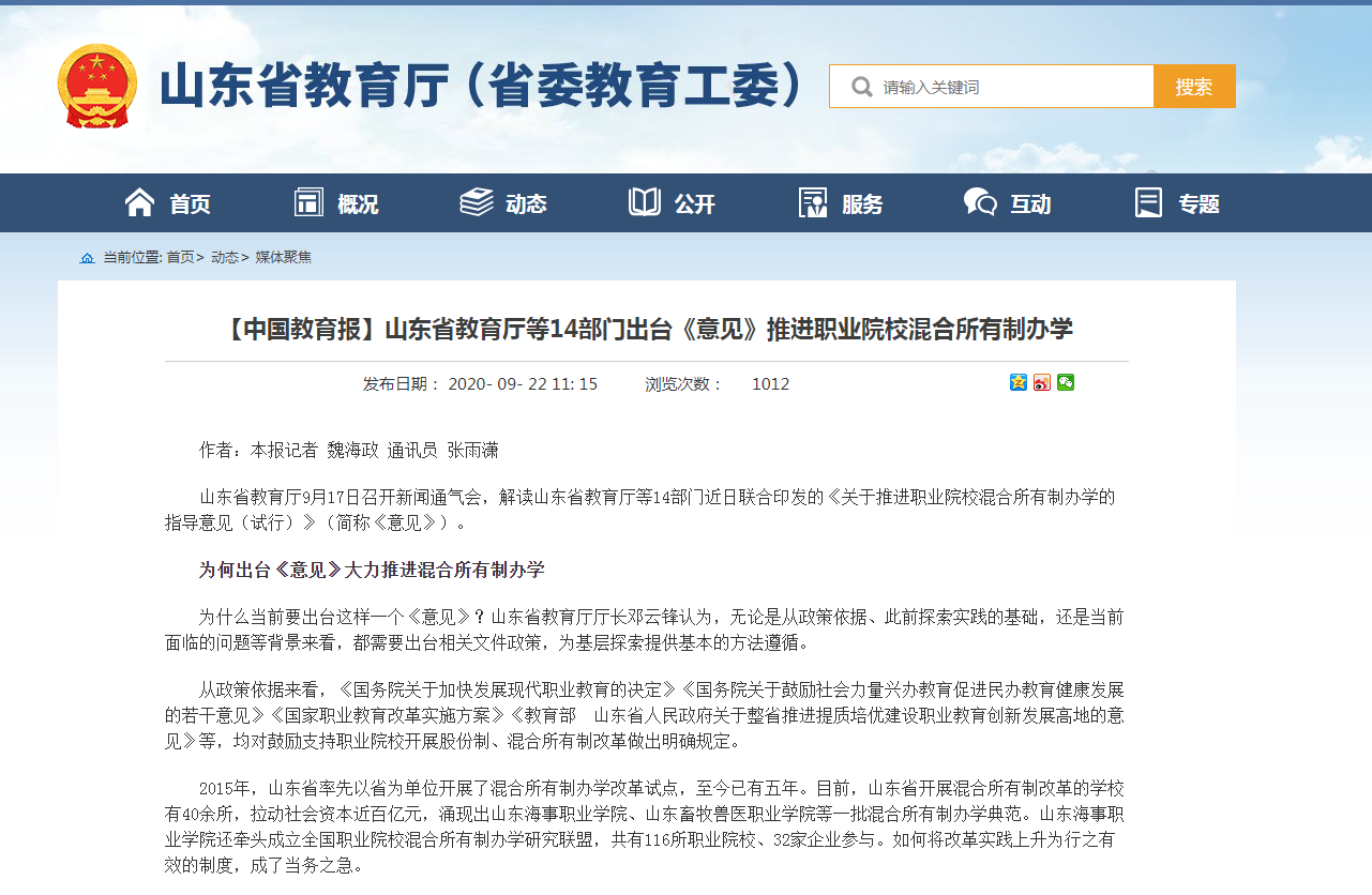 为发展职业教育,山东省教育厅等14部门发布了《关于推进职业院校混合所有制办学的指导意见(试行)》(简称《指导意见》),要求充分发挥企业重要办学主体作用,以“混”促“改”,建立各方深度参与的多元治理体系和现代学校制度,构建市场化的激励机制,全面推进面向市场开放办学。