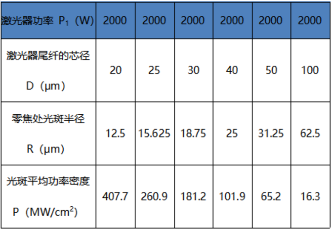 公式3:光斑平均功率密度:P=P₁/( π* R² ) (P₁ :激光器功率)