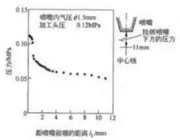 4.适当缩短切割高度。切割高度不仅直接决定了喷嘴与金属材料表面之间的等离子云团厚度(距离越短,等离子云团越薄),而且越靠近切割喷嘴,喷嘴中心喷出的切割气体压力会越高(见图2),切割气压升高有助于加快喷嘴下方等离子云团的散开,减少等离子云团对入射激光的屏蔽。所以在保证切割头安全的前提下,随动距离越近越好。