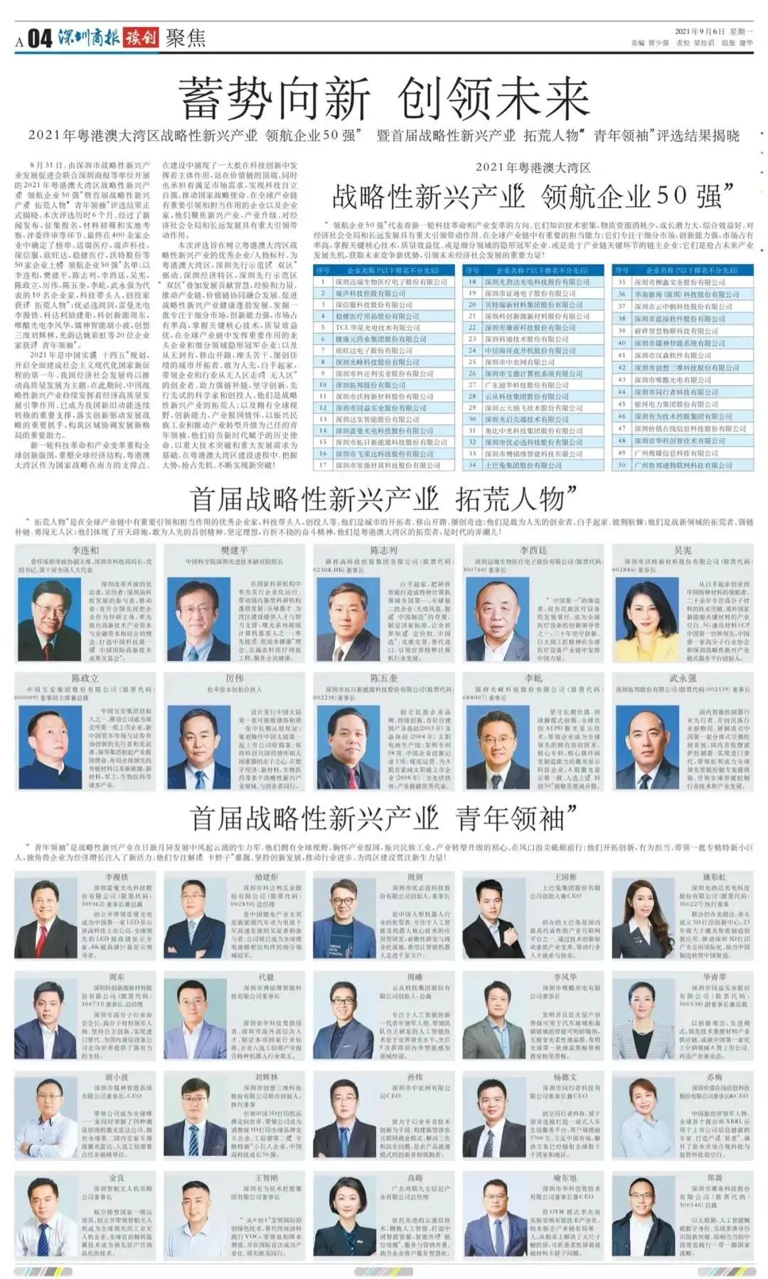 8月31日,由深圳市战略性新兴产业发展促进会联合深圳报业集团·深圳商报等单位开展的2021年粤港澳大湾区战略性新兴产业“领航企业50强”暨首届战略性新兴产业“拓荒人物”“青年领袖”评选结果正式揭晓。本次评选历时6个月,经过了新闻发布、征集报名、材料初筛和实地考察、评委终审等环节,最终在400余家企业中确定了榜单。