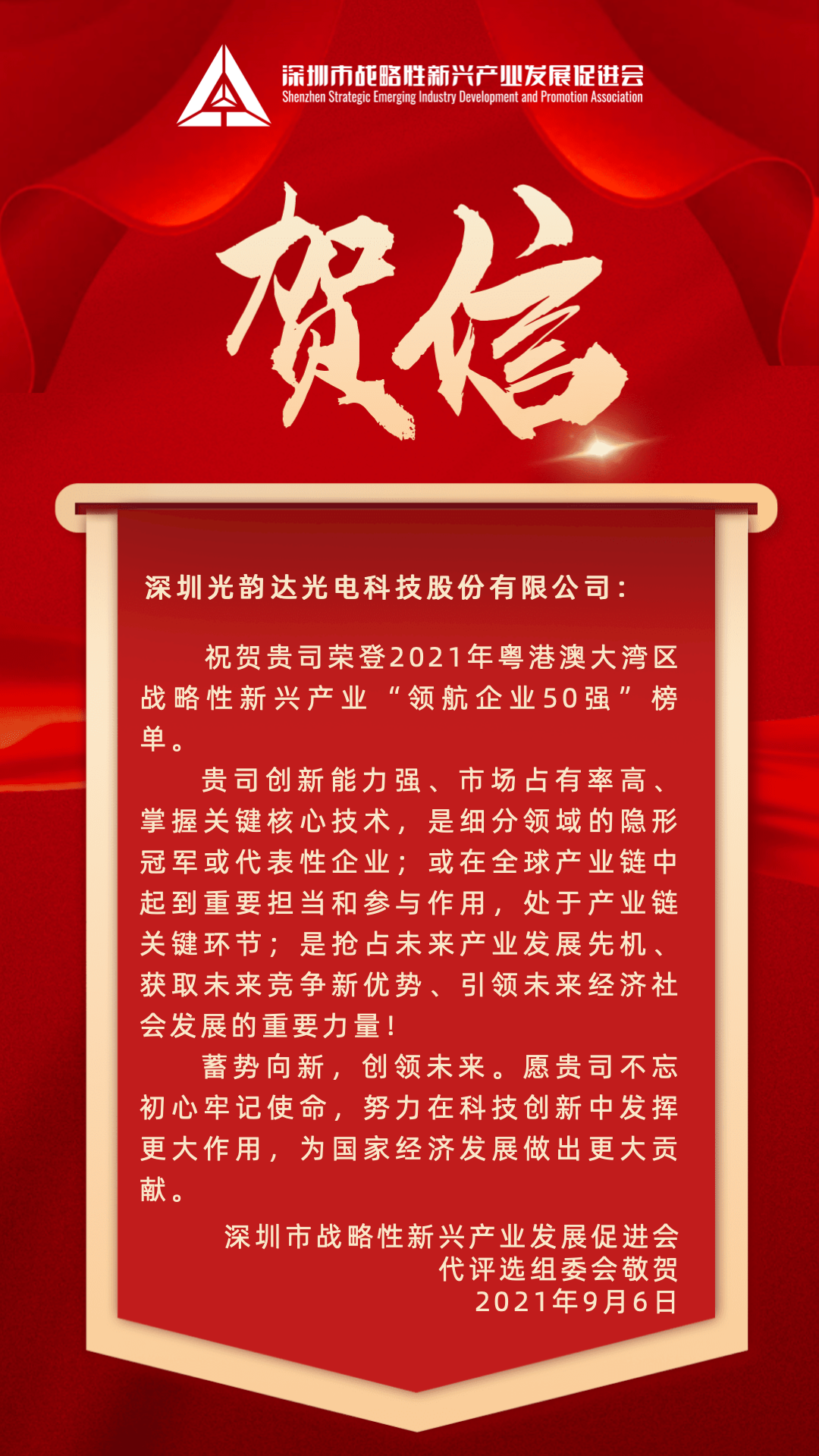 深圳光韵达光电科技股份有限公司,在2021年粤港澳大湾区战略性新兴产业中,荣获2021年粤港澳大湾区战略性新兴产业“领航企业50强”,这代表着深圳市战略性新兴产业发展促进会对光韵达的肯定,光韵达将带领新一轮科技革命和产业变革的方向,对经济社会全局和长远发展承担起引领带动作用,抢占未来产业发展先机、获取未来竞争新优势、引领未来经济社会发展的重要力量!