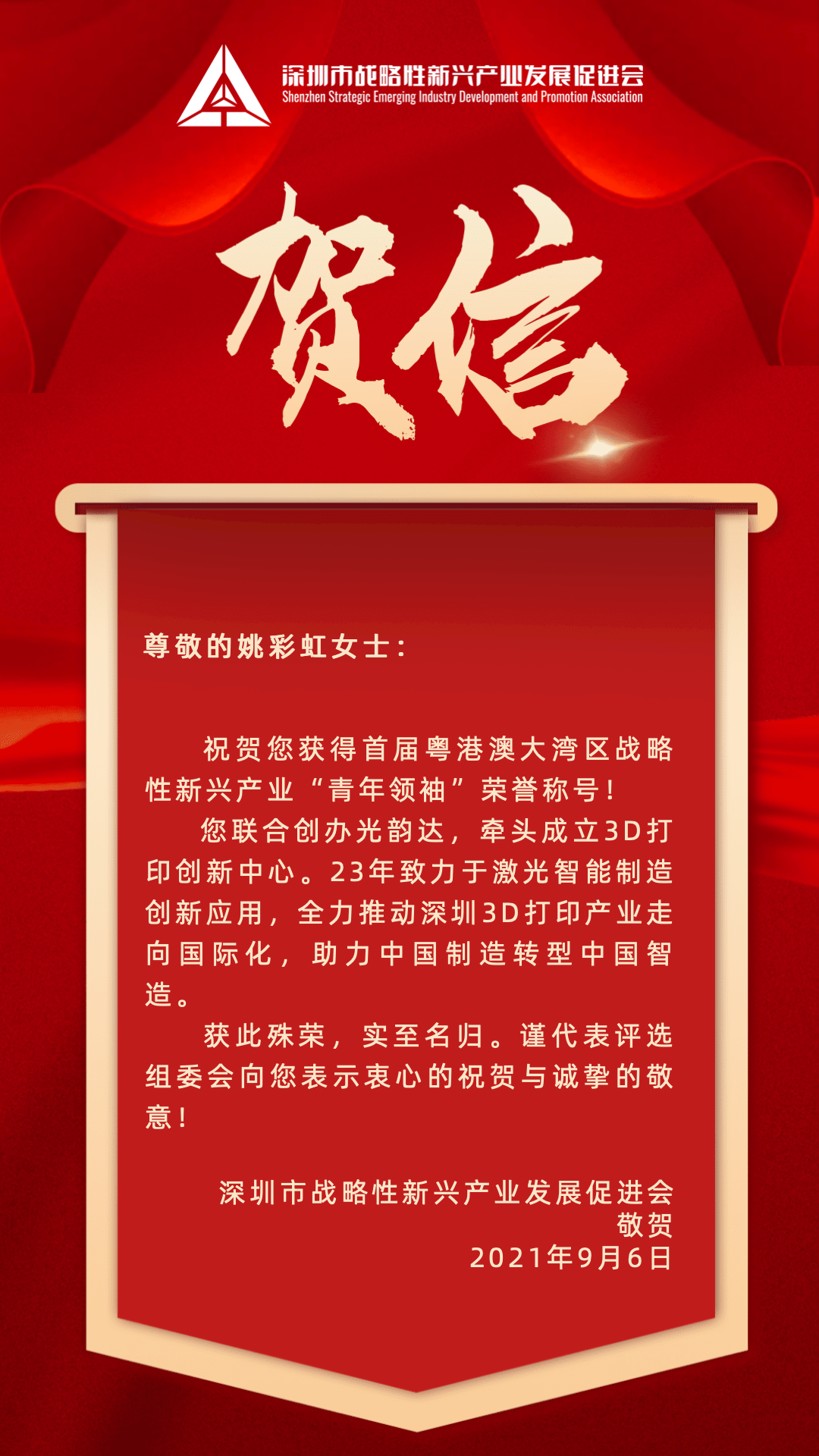 光韵达董事姚彩虹女士荣膺“青年领袖”称号。作为“青年领袖”的代表,姚彩虹女士在战略性新兴产业的日新月异发展中,她是风起云涌的生力军,她拥有全球视野,保持着振兴民族工业、产业转型升级的初心,在风口浪尖砥砺前行;开拓创新、有为担当。坚持创新发展、推动行业进步,为湾区建设注入新生力量!
