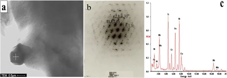 ▲图8 TEM/EDS光谱:焊缝中的Laves粒子: (a)亮场图 (b)在(3 -3 0 -1)晶带轴中的SAED图案,以及(c)相应的EDS结果
