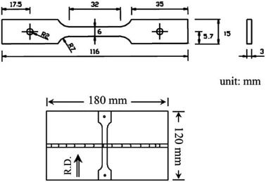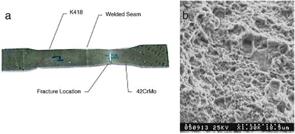 焊接方向、拉伸试样取样方向和试样尺寸示意图如图10所示。图11显示了横向拉伸试验期间的断裂位置,SEM图像显示了基础合金钢42CrMo的拉伸断裂表面。