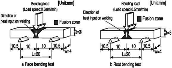 弯曲试验是一种简单而较低成本的定性试验,可用于评估焊接接头的延展性和牢固性。用于弯曲试验的弯曲试样程序的配置以及焊缝和基材的弯曲性能如图12所示。EN 910/[ISO 5173]是熔焊接头中焊接金属弯曲试验的重要标准。
