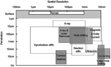 ▲图17 各种非破坏性技术的当前应力测量能力示意图,破坏性技术是灰色阴影区域。