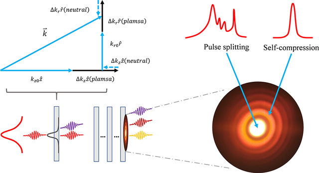 中国科学院物理研究所/北京凝聚态物理国家研究中心光物理重点实验室魏志义研究组(L07组)多年来致力于少周期激光脉冲产生的研究,最近该组博士研究生高亦谈在赵昆、魏志义等人的指导下,基于研究组内发展的薄片组光谱展宽技术,利用飞秒钛宝石放大激光电离产生的锥状辐射效应,通过在空间上精确寻找到色散匹配最佳位置,并配合空间滤波,最终获得了少周期飞秒自压缩脉冲。实验中他们所用钛宝石激光器的中心波长约800nm,脉宽小于40 fs。在该激光脉冲注入下,产生了光谱覆盖从650至900nm、脉宽短至8.8 fs的少周期脉冲,数值模拟的最短脉宽达5.0 fs。该工作展示了在800nm中心波长附近能稳定产生少周期自压缩脉冲的方法,首次实现了在固体材料自压缩中对电离的调控,其在高功率少周期脉冲产生以及后续的阿秒脉冲产生方面存在巨大的潜力。