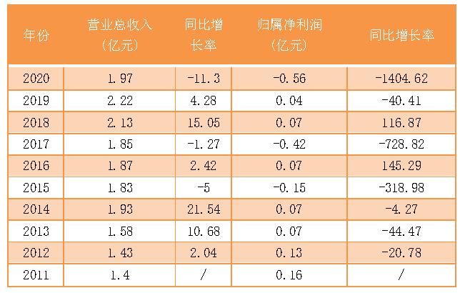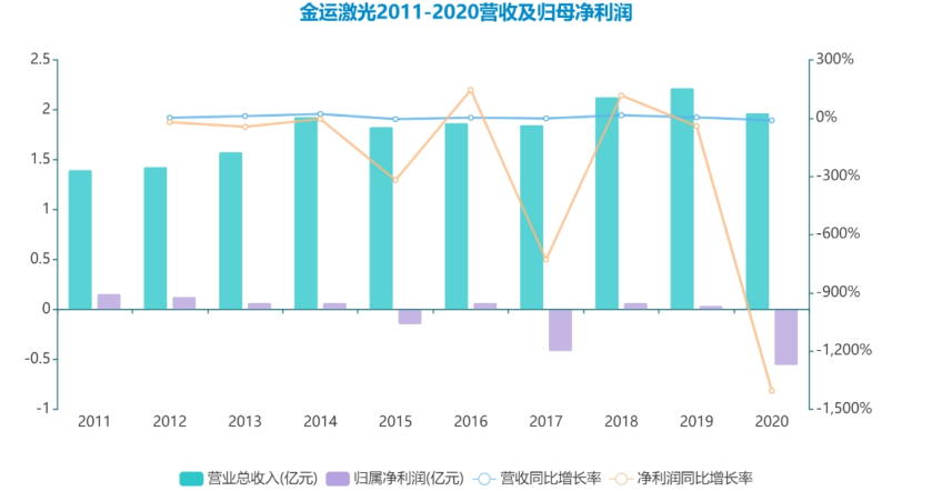 表 金运激光2011-2020年度营收及净利润