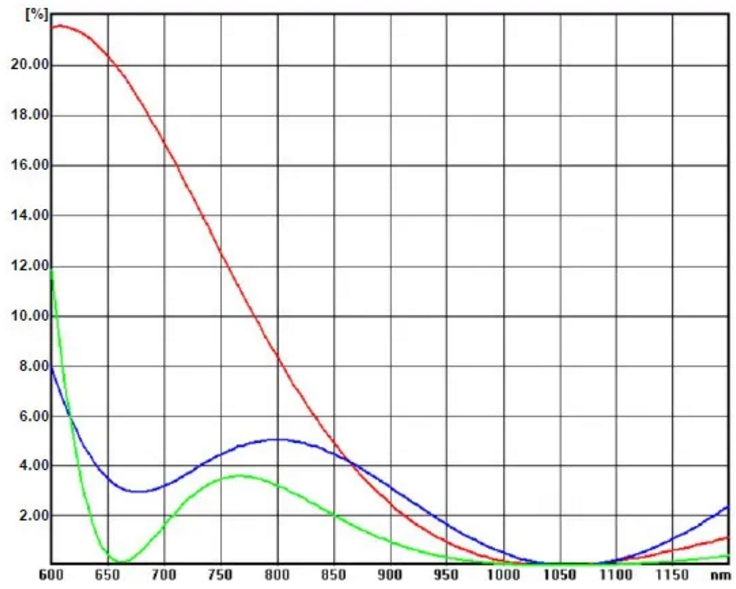 图 3 以下涂层的反射率:红线 – 在光谱范围 1030-1140nm 内,R < 0.05% 的多层增透膜;蓝线 –适用于光谱范围650nm-1030nm 的双层增透膜,含 Ta2O5 厚高反射率材料;绿线 – 适用于光谱范围 650nm-1030nm 的双层增透膜,含 HfO2 厚高反射率材料。