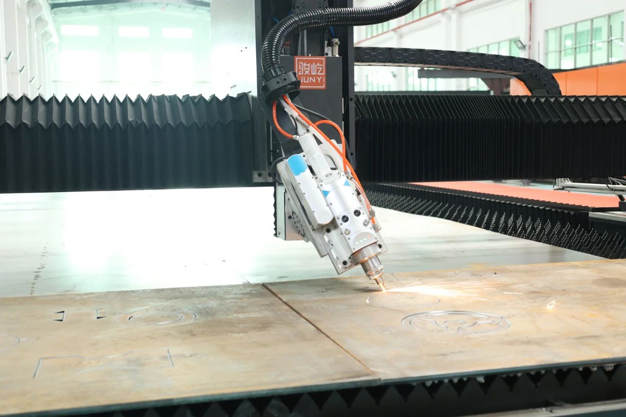 在本次发布会上,骏屹激光推出大幅面激光切割机定制方案,该方案12kw-30kw功率可选,加工宽度可定制 2.5/3.5/4.5/5.5米,加工长度可定制9-15米,采用了机械式防护+传感技术,该机型主要是针对大尺寸大厚度的板材,目前宽度可以做到5.5米以内,长度可以做到50米,并大幅提升加工效率。另一款重磅机型处理超大幅面厚板更灵活,加工坡口一次成型。