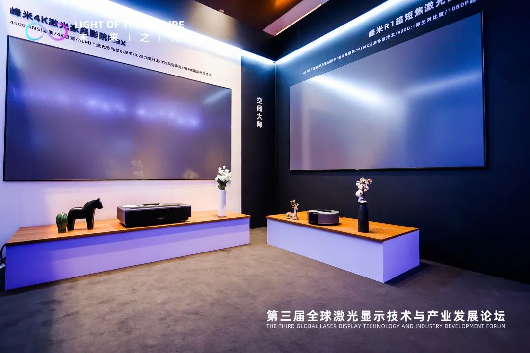 论坛现场,光峰科技旗下子公司峰米科技实体展示“4K激光家庭影院Max”和“峰米R1超短焦激光微投”两款家用激光投影产品。