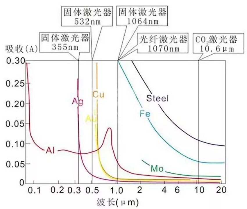 一般来讲,高反指的是由于加工材料电阻率较小,表面较为光滑,对近红外激光的吸收率较低,如图所示,为常见金属元素的吸收系数,这导致大量的激光发生发射,又因为大多数激光器的使用场景均为垂直于材料或者少量倾角。从而导致回返激光重新进入输出头,甚至部分回返光耦合进入传能光纤,沿光纤反向传输至激光器内部,使得激光器内部核心部件持续高温。