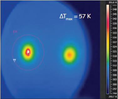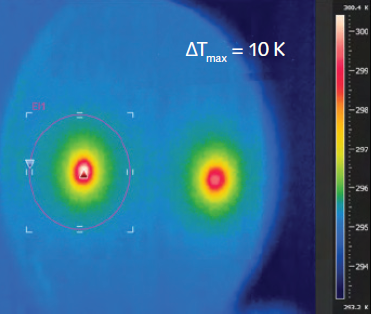 测试这些新型色散镜膜层,以确定存在的热透镜水平。使用红外相机(FLIR SC305)测量了Yb:YAG碟片激光器内腔内色散镜的温度。激光器在连续波操作下进行了测试,因为这是实现锁模之前激光器的行为方式。标准的高反镜的GDD为-3000fs2,但没有减少热透镜效应的膜层,温度升高>50K(见图3)。这种温度变化了导致振荡器稳定性恶化,以及发射激光模式的变化。