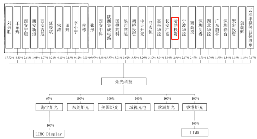 截至炬光科技招股说明书签署日,发行人股权结构如下图所示。其中,华为投资控股有限公司控股的哈勃投资持有公司2.96%的股份。