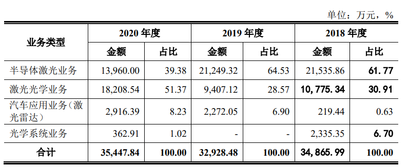 从业务类型来说,报告期内,公司主营业务收入及占比按业务类型列示的构成情况如下。2018-2020年,半导体激光业务占比由61.77%下降到39.38%,激光光学业务则由30.91增长至51.37%。