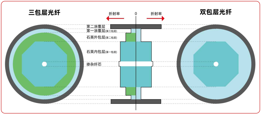 随着工业级高功率连续光纤激光器的快速发展,传统20/400um,25/400um光纤很难做到5KW以上的单根光纤输出,如需再提升单根光纤的功率值,目前主流的方案是采用石英材料代替树脂材料的三包层光纤作为增益光纤。此结构中输出光纤也需要采用匹配的三包层光纤。由于泵浦光在光纤的内包层中传输,三包层光纤采用石英材料作为外包层,在制作泵浦剥除器时,需要将石英外包层完全破坏后,再对内包层进行处理。因此,在泵浦剥除器的制作过程和难度上较传统的双包层光纤难度都有不小的提升。
