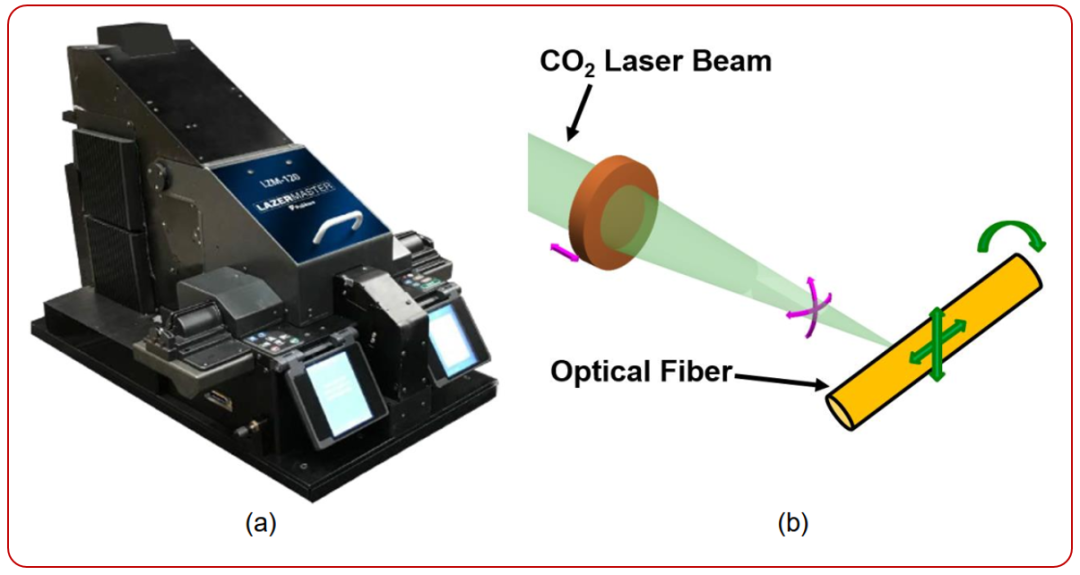 我们用于制造泵浦剥除器的机器是Fujikura LZM-120A+,如图1(a)所示,其特点是除了传统的聚变光束主要是用于光纤熔接,拉锥和烧球,LZM-120A+还具有如图1(b)所示的销蚀光束。
