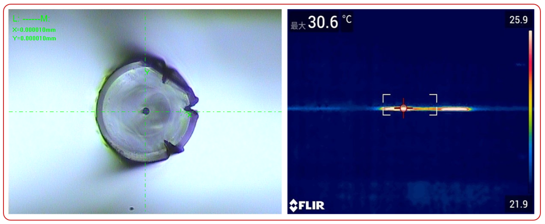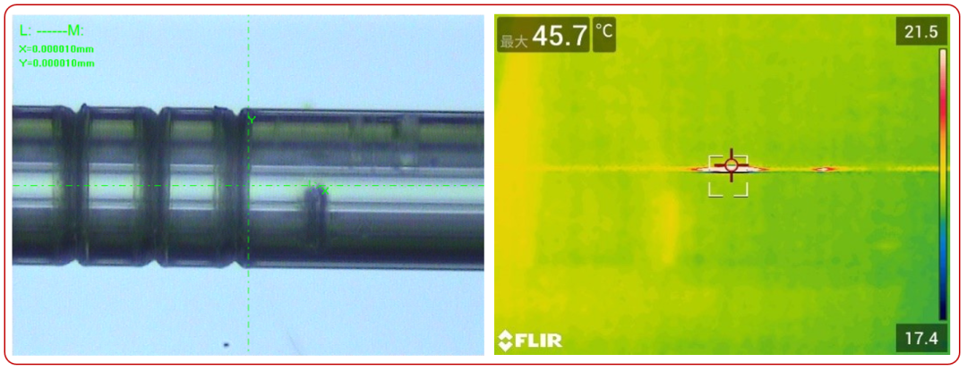 实测效果,在三包层光纤刻3条直线槽,深度约72um,长度1cm,由于刻槽的条数较少,剥除率较低,但外观看光纤的外观不平整,有毛刺,因此在较低的功率下温度已经上升到30℃以上。这种工艺条件下,光纤的强度较环刻法上升很多,光纤不易折断。但由于外观及效率不佳,因此舍弃此方案。