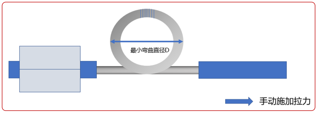 在光纤激光器系统中,光纤除了受到拉力,经常需要进行弯曲,因此光纤的最小弯曲半径也是衡量光纤强度的一个重要指标,因此我们对刻蚀后的光纤进行了最小弯曲半径测。光纤一端固定,将光纤打盘成光纤环,通过施加拉力将光纤环不断缩小,直至光纤断裂,记录光纤断裂时的光纤环直径,即为最小弯曲直径。