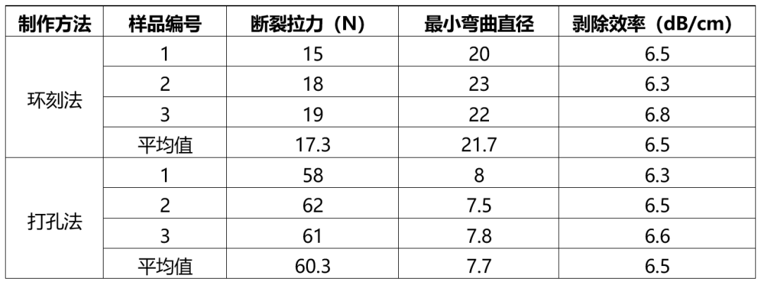 我们采用二氧化碳销蚀工艺,对三包层光纤表面进行打孔处理,可以得到6.3dB/cm的剥除效率,处理后剥除器的抗拉强度大于60N,最小弯曲半径可以小于8cm。
