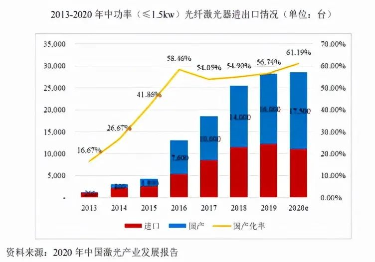 从国产化替代现状来看,不同功率激光器的国产化率有差异。下图摘自长光华芯招股书,能够较为明显地看出不同功率之下光纤激光器的国产化替代情况。2019年,小功率光纤激光器的国产化率就已经逾99%,几乎实现全覆盖。而同年中功率及高功率光纤激光器的国产化率都在56%左右,国产化替代市场仍旧有一定空间。