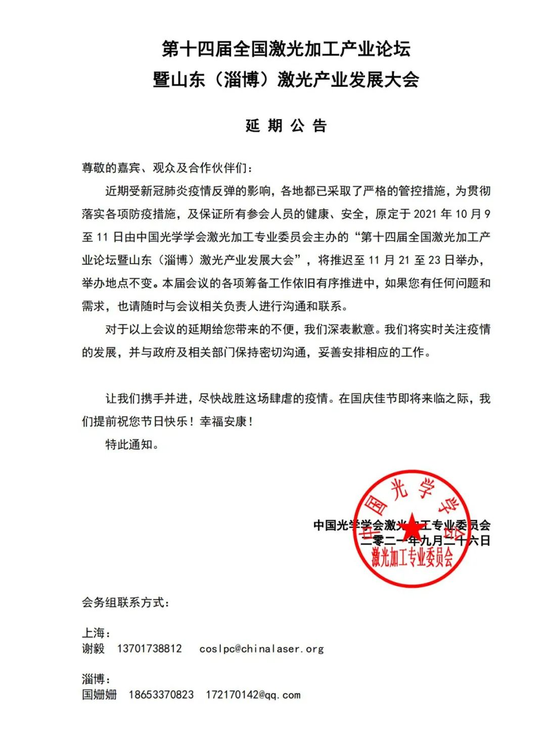 近期受新冠肺炎疫情反弹的影响,各地都已采取了严格的管控措施,为贯彻落实各项防疫措施,及保证所有参会人员的健康、安全,原定于2021年10月9至11日由中国光学学会激光加工专业委员会主办的“第十四届全国激光加工产业论坛暨山东(淄博)激光产业发展大会”,将推迟至11月21至23日举办,举办地点不变(山东齐盛国际宾馆)。本届会议的各项筹备工作依旧有序推进中,如果您有任何问题和需求,也请随时与会议相关负责人进行沟通和联系。