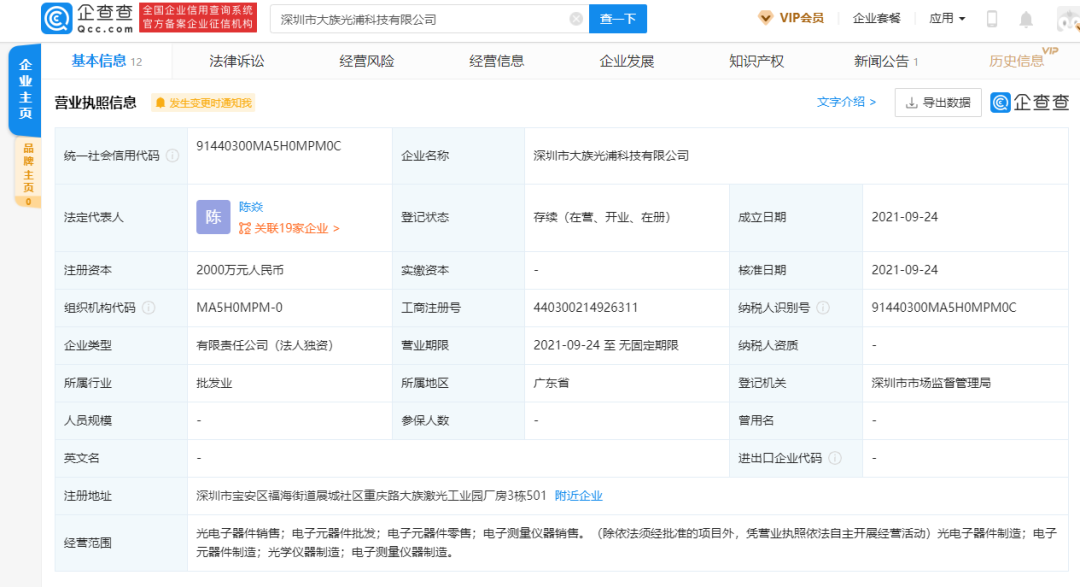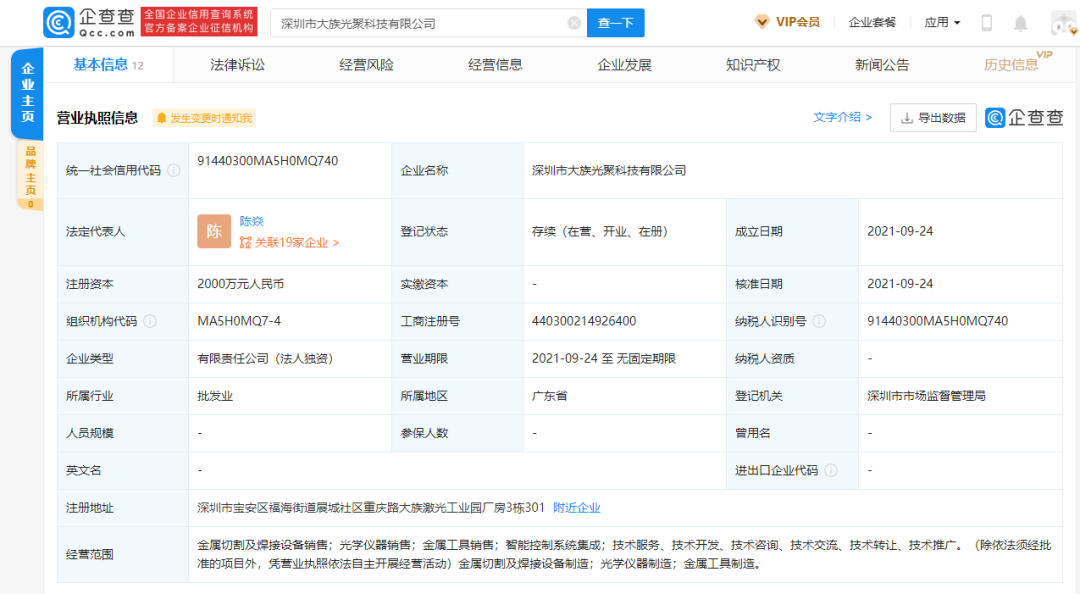 企查查显示,9月24日,大族激光科技产业集团股份有限公司成立2家全资子公司——深圳市大族光浦科技有限公司及深圳市大族光聚科技有限公司。