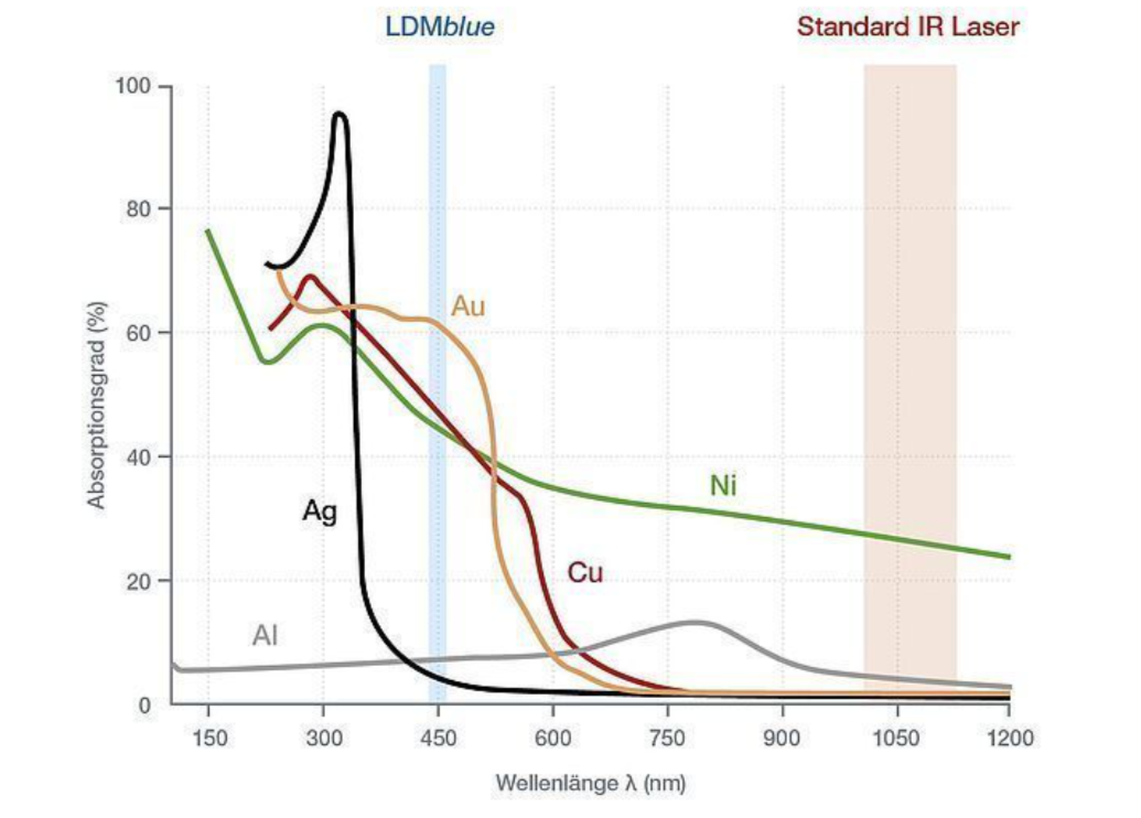 蓝色激光也适用于电子产品大批量制造上,例如手机、平板电脑和计算机的制造——任何以铜为主要元件的应用。蓝色激光在焊接铜、不锈钢和铝方面已经证明了其优势。事实上,蓝色激光也适用于薄金属之间的低/无缺陷快速连接。
