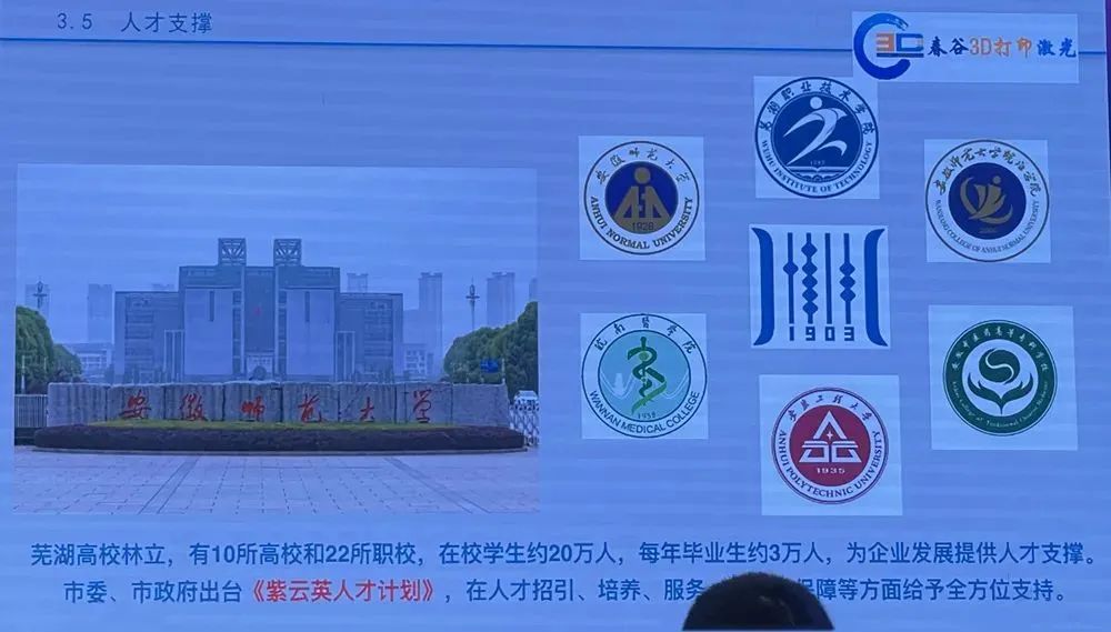 在人才支撑方面,芜湖有10所高校和22所职业院校,在校学生约20万人,每年毕业生有2万人,可为企业发展提供强有力的人才支撑。市委市政府出台《紫云英人才计划》,在人才的招引、培养、服务、激励保障等方面给予全方位的支持。同时我们园区已经成为多所院校的人才实习、实训、就业前储备了丰富的人力资源。我们中科大、中国药科大学、安医大等等,今天的繁昌已经成为3D打印激光产业创新高地、创业福地,我们热忱的欢迎各位朋友莅临考察、交流、投资兴业,谢谢大家。