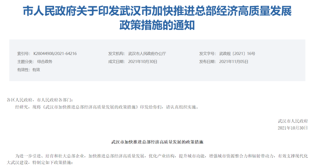 吸引培育总部企业武汉拿出多项真金白银的奖励