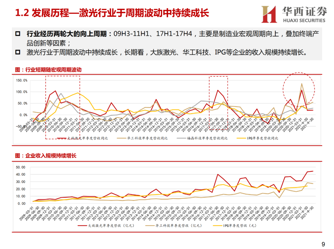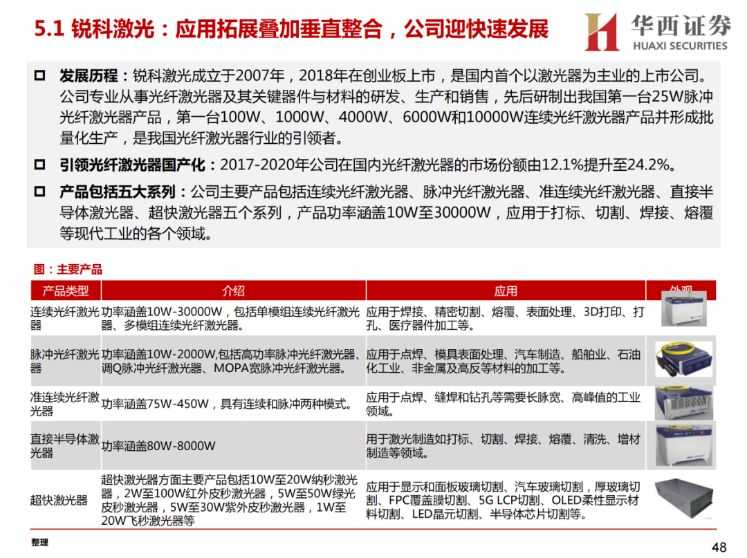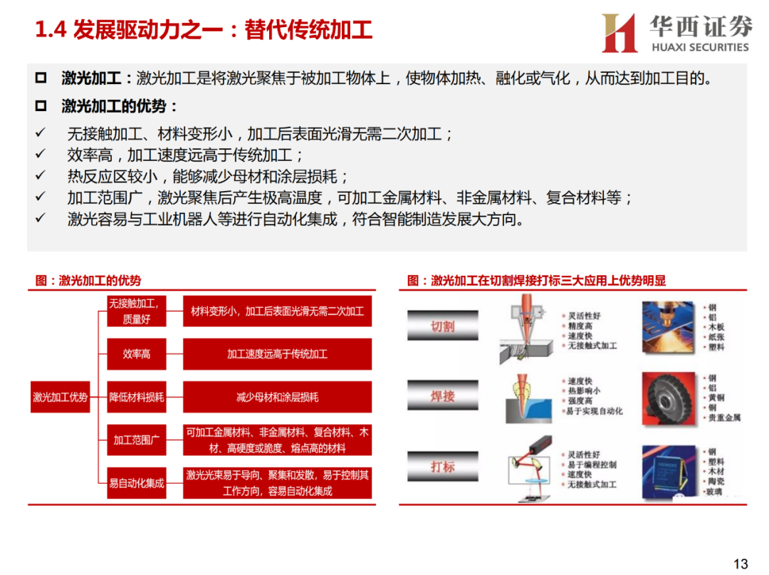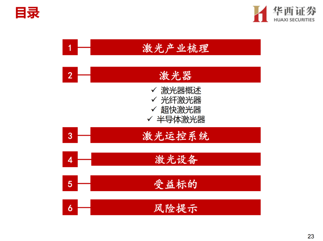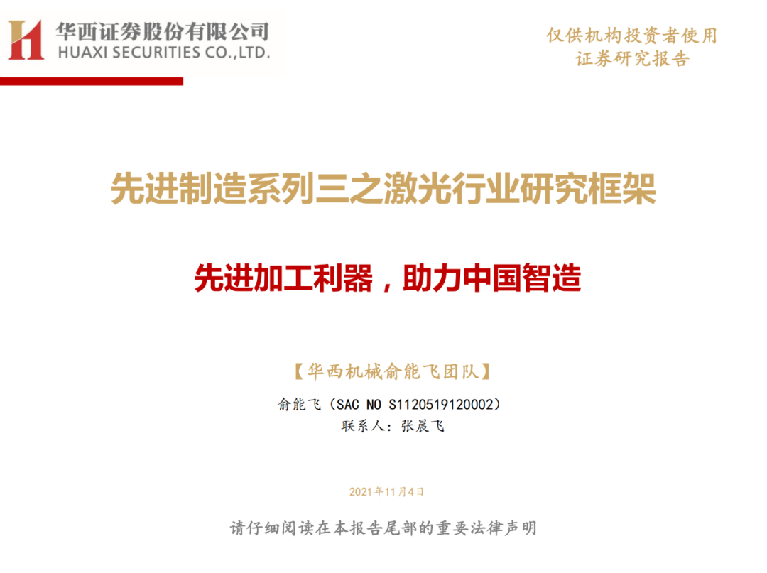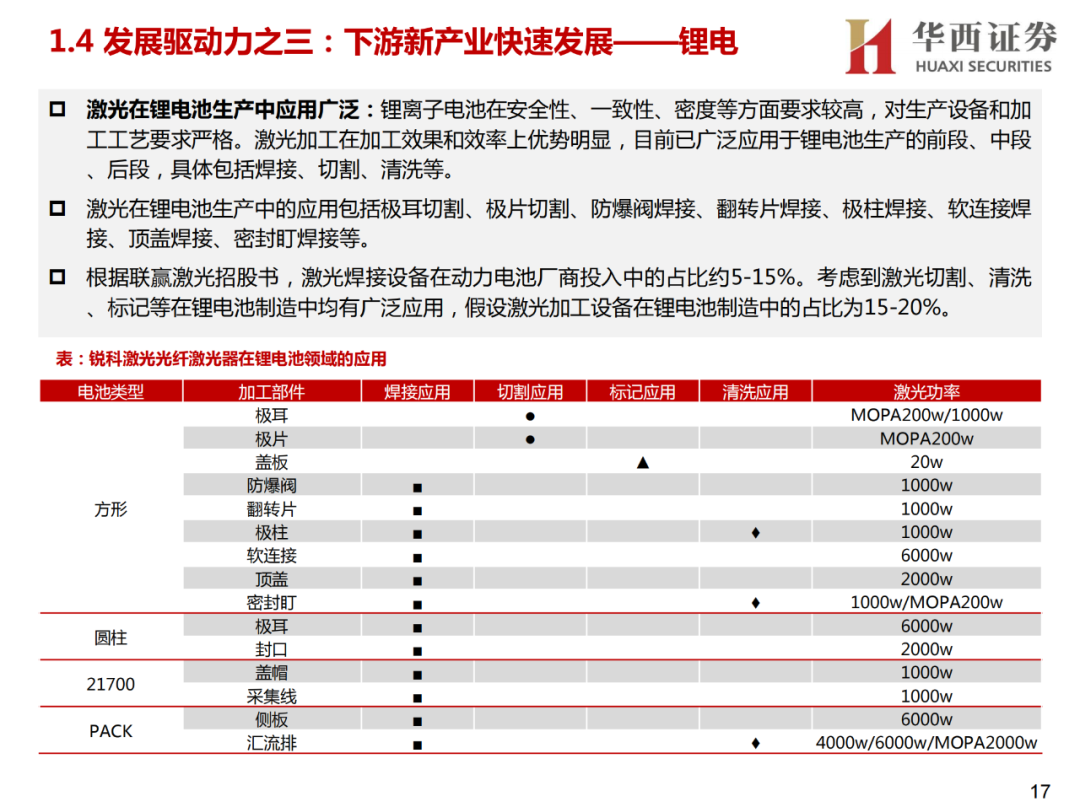 激光行业短期随宏观波动,长期持续成长可期。(1)行业短期跟随宏观周期和下游行业进行波动,长期受益于渗透率提升和新领域持续拓展;(2)行业处于成长期,增长空间巨大,建议关注产业链各环节具备竞争优势的企业;(3)激光替代传统加工、清洗熔覆等新应用持续拓展、下游光伏锂电等行业高速增长,三大因素推动激光行业发展。