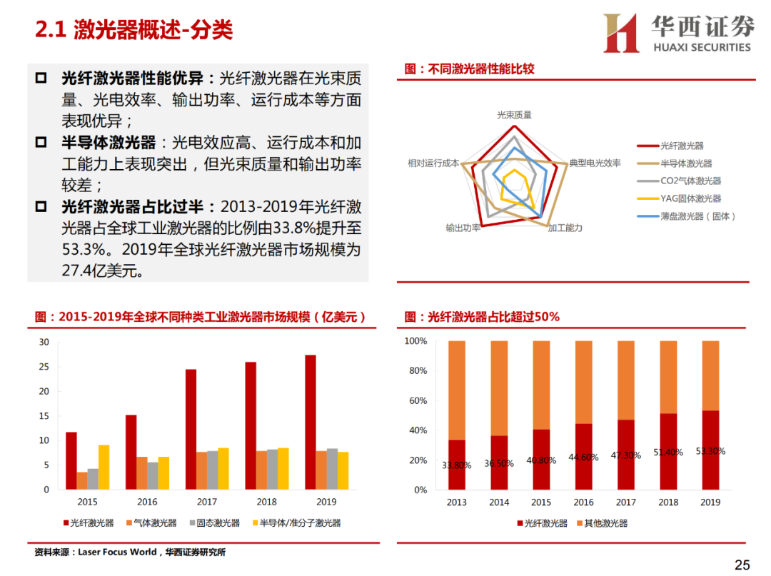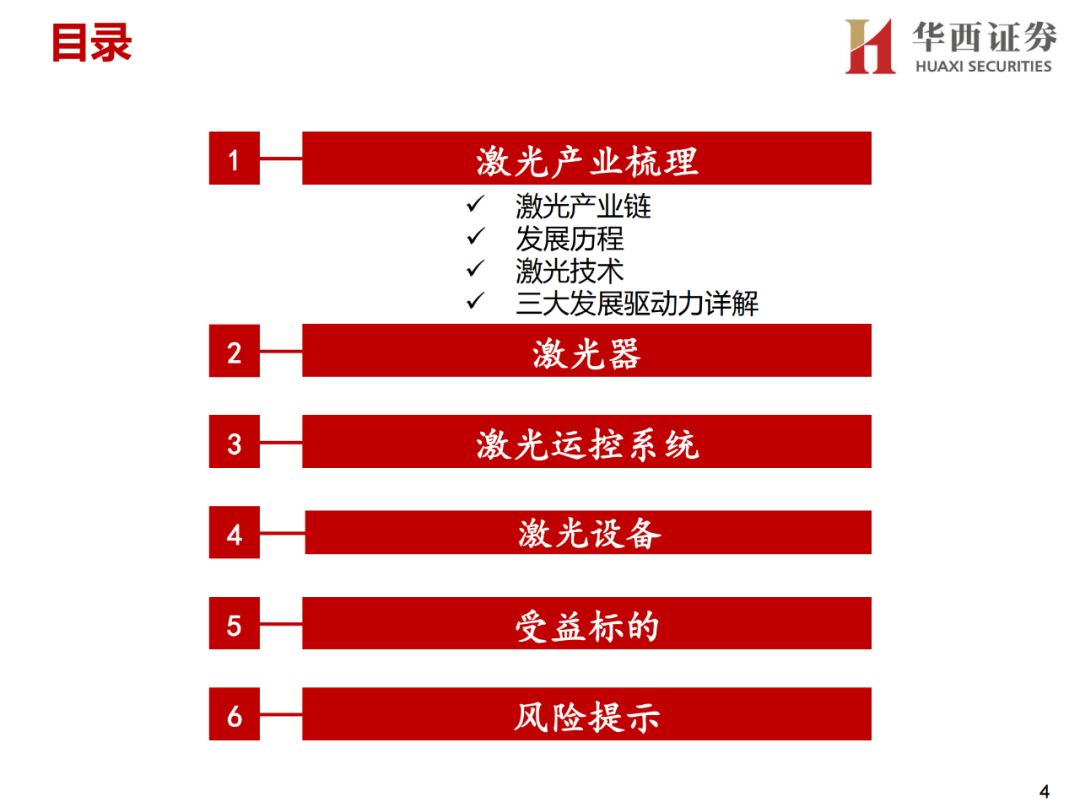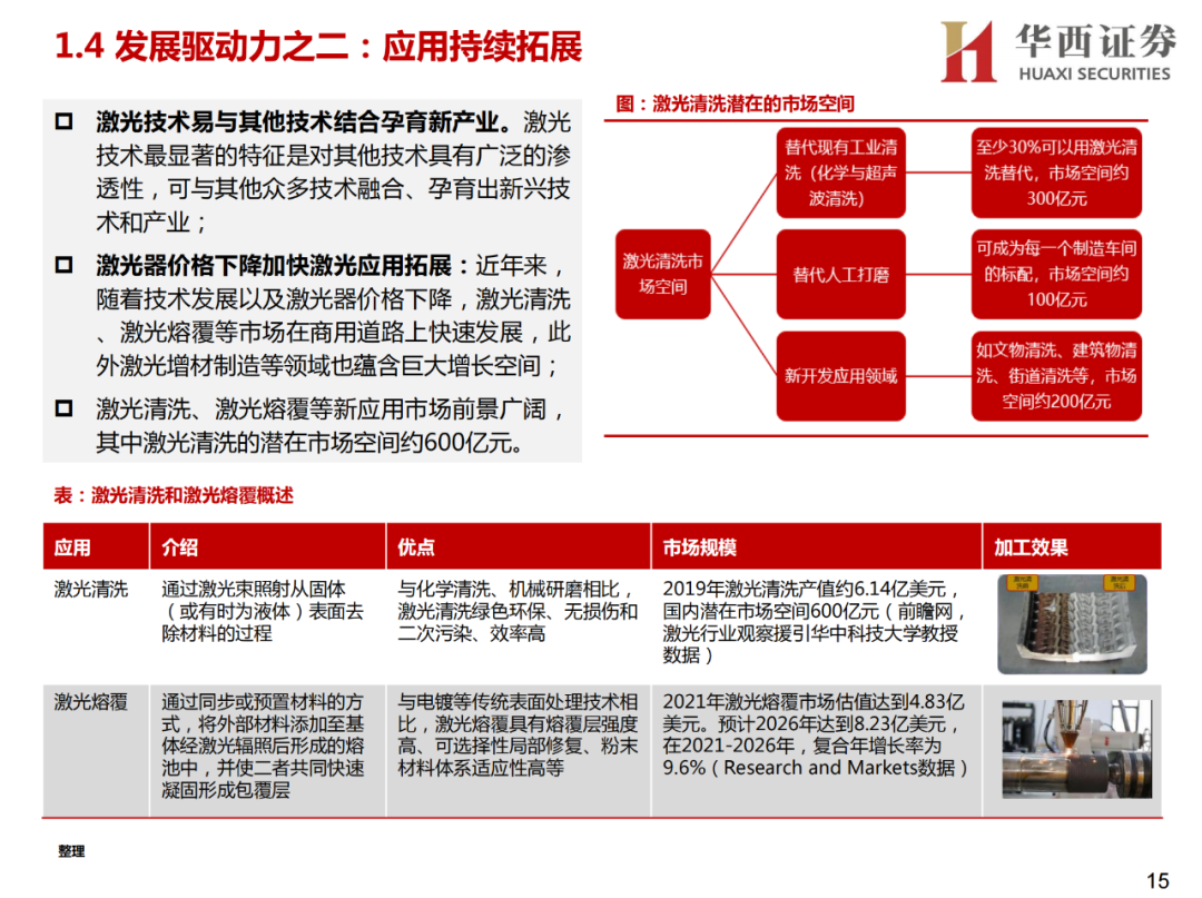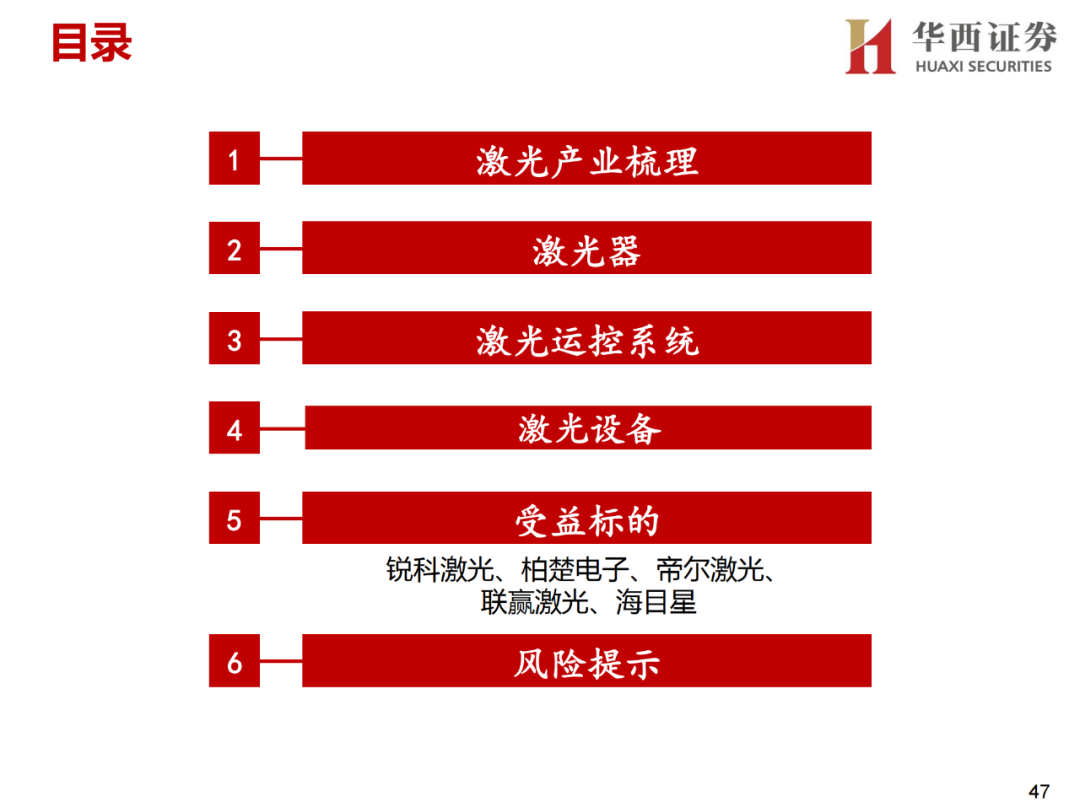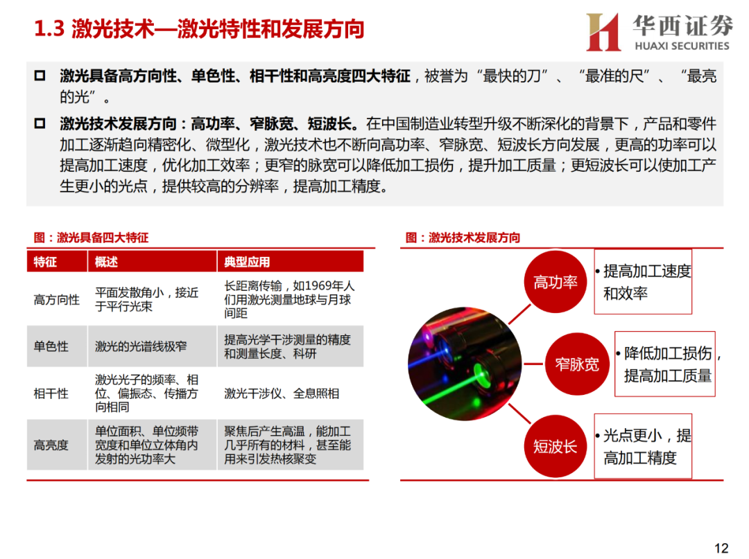 激光行业短期随宏观波动,长期持续成长可期。(1)行业短期跟随宏观周期和下游行业进行波动,长期受益于渗透率提升和新领域持续拓展;(2)行业处于成长期,增长空间巨大,建议关注产业链各环节具备竞争优势的企业;(3)激光替代传统加工、清洗熔覆等新应用持续拓展、下游光伏锂电等行业高速增长,三大因素推动激光行业发展。
