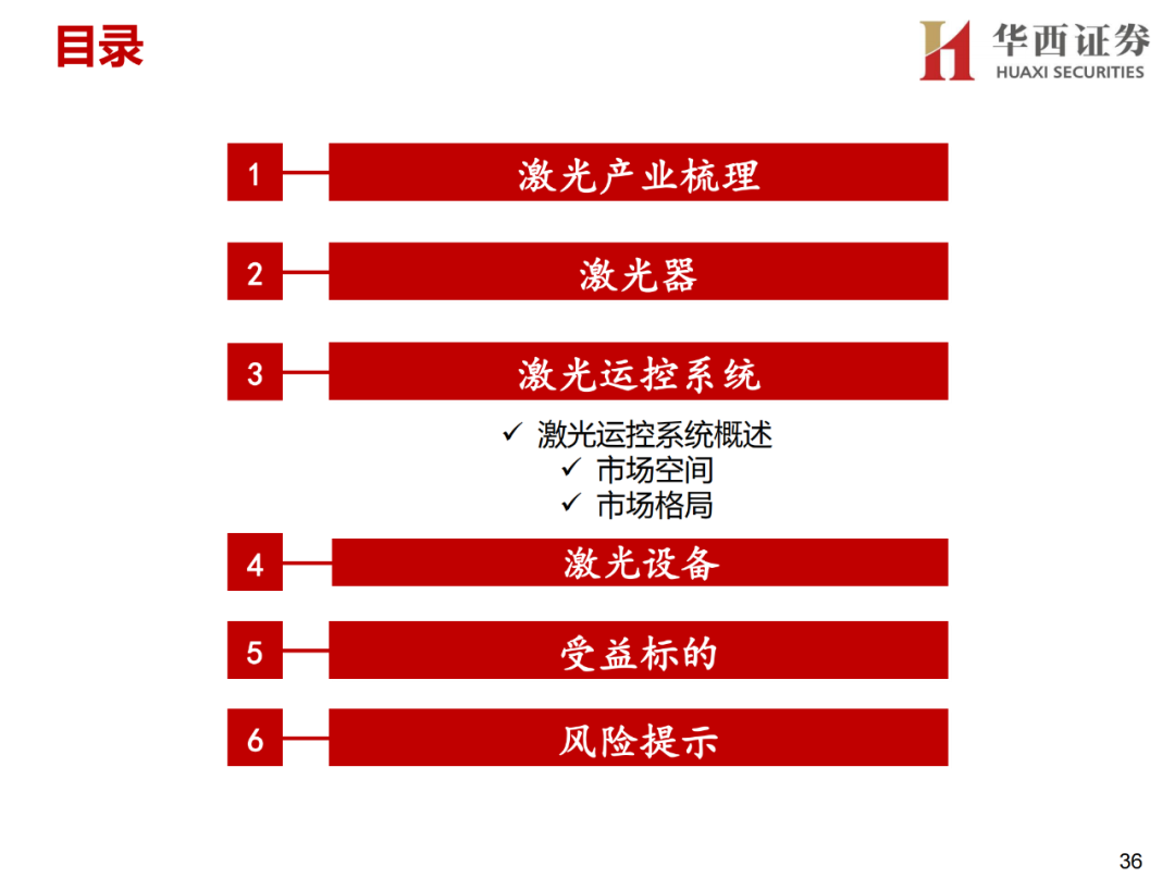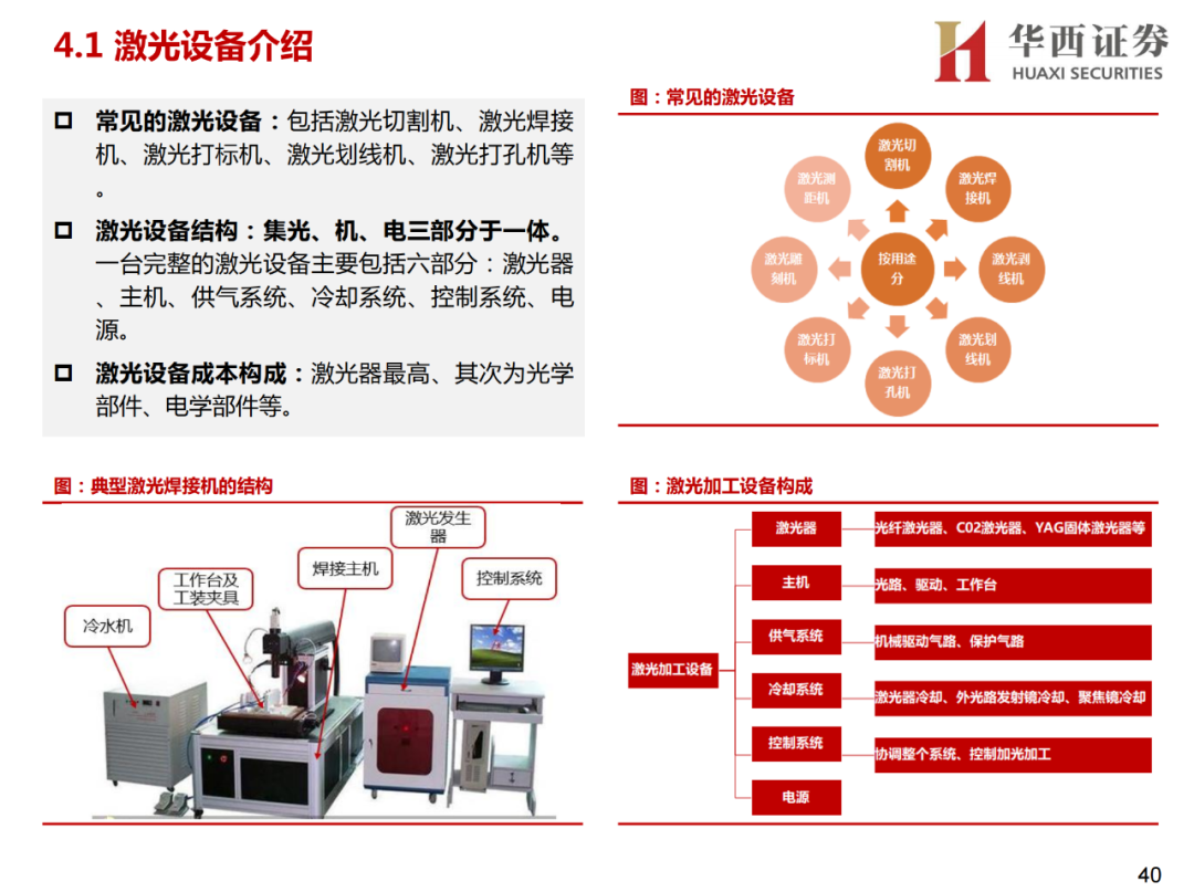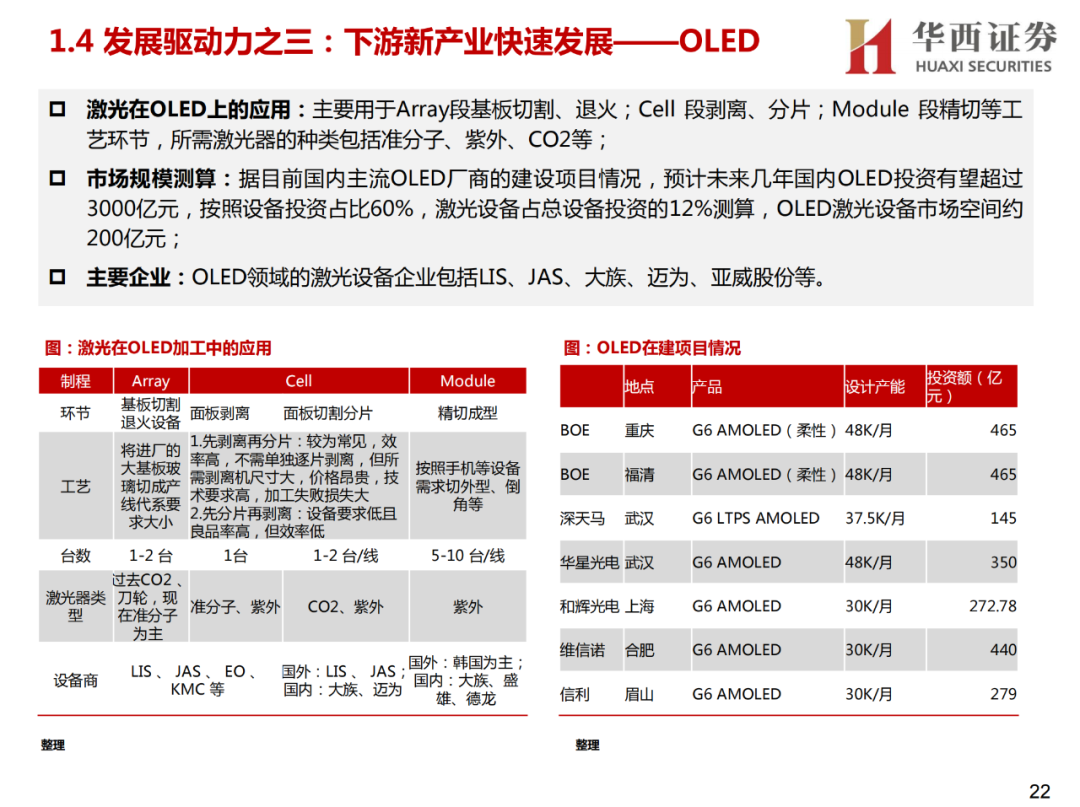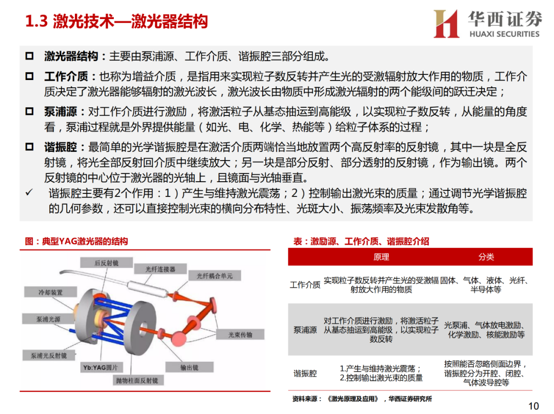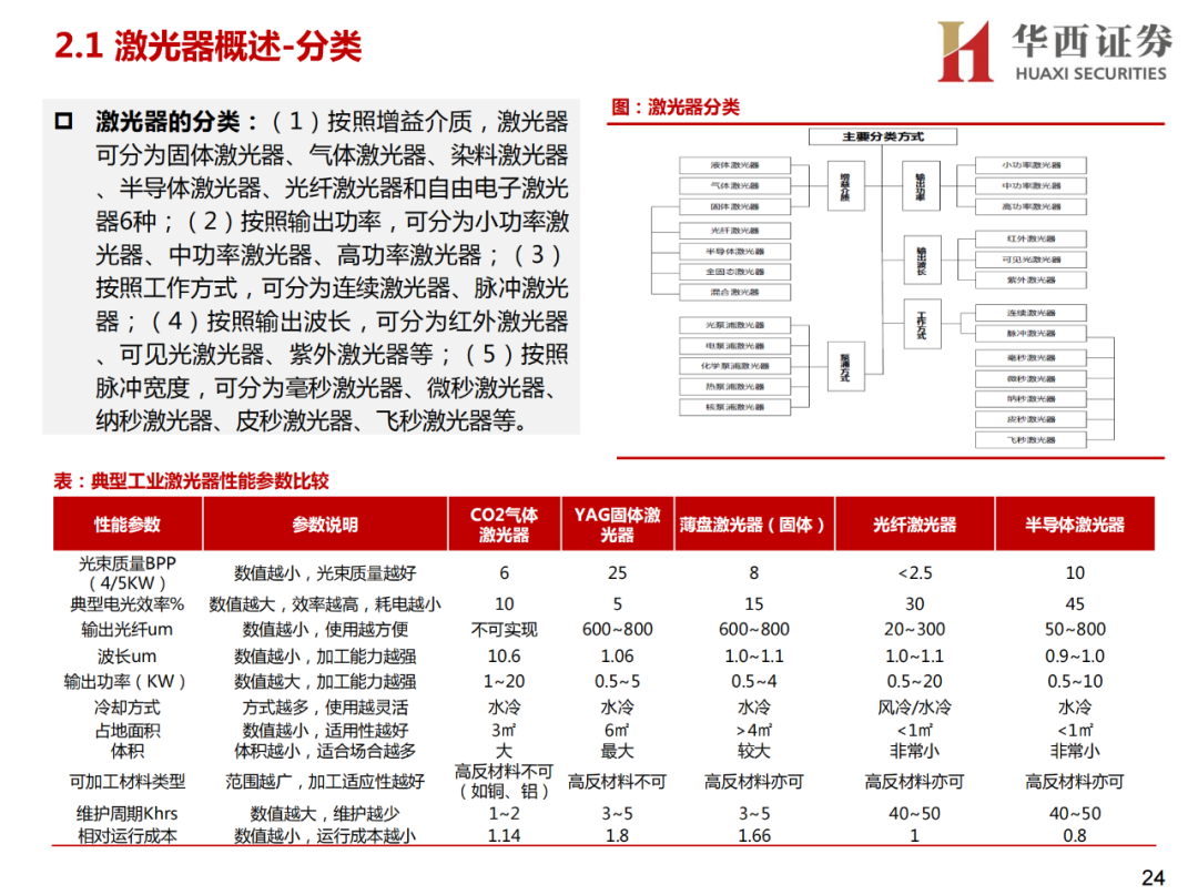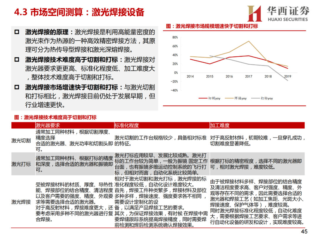 激光行业短期随宏观波动,长期持续成长可期。(1)行业短期跟随宏观周期和下游行业进行波动,长期受益于渗透率提升和新领域持续拓展;(2)行业处于成长期,增长空间巨大,建议关注产业链各环节具备竞争优势的企业;(3)激光替代传统加工、清洗熔覆等新应用持续拓展、下游光伏锂电等行业高速增长,三大因素推动激光行业发展。